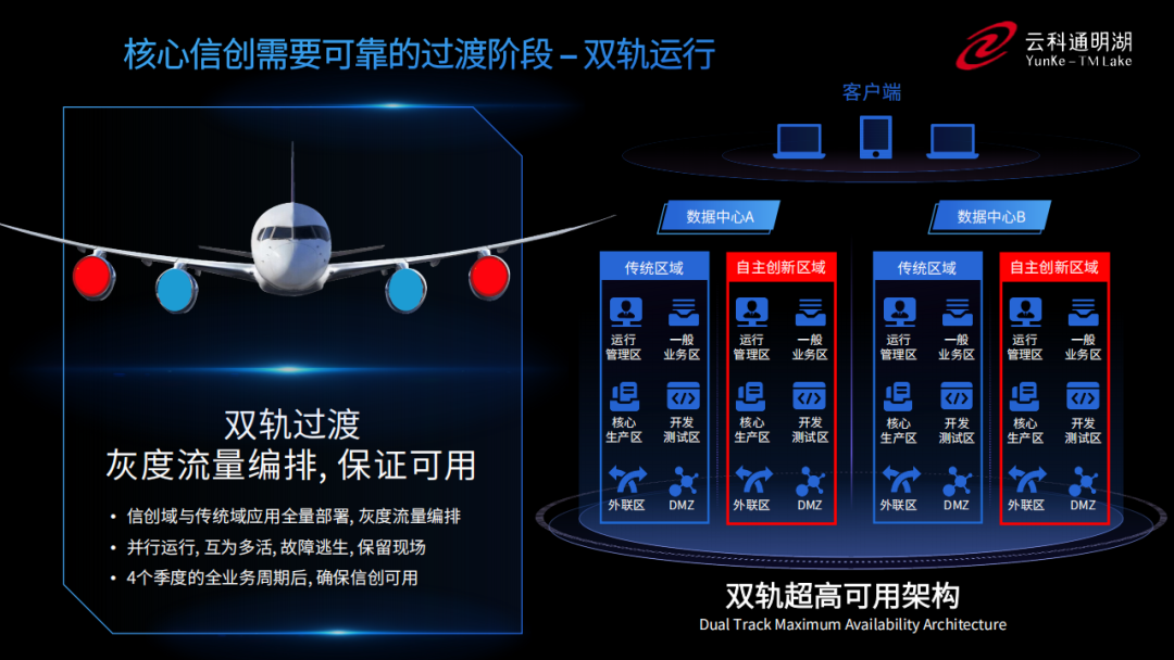 双轨超高可用架构在双活数据中心的分区调度基础上,增加信创域和非信创域的分域调度,实行信创域与传统域应用全量部署,使双中心运营变为双中心四区域并行运行,互为多活,将传统架构变为分区分域协同的多活双轨超高可用架构。帮助客户在新架构下,保障“信创”的同时解决性能瓶颈,提升稳定性,保证应用可持续性,最终实现信创区域和非信创区域的平滑过渡,完成国产化替代目标。